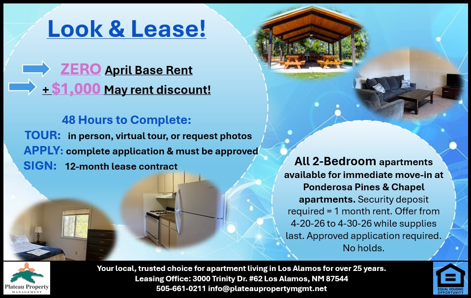 Ponderosa #54 - 2-bed/1-bath, fully furnished, 2nd floor, 825 sq. ft. $2,050/mo + all utilities & internet included. Dog Friendly! https://plateaupropertymgmt.appfolio.com/listings/detail/e5be35f5-9f07-4749-b89f-14c91bce7194